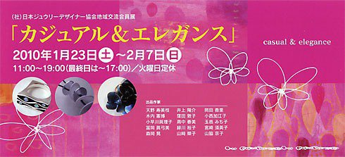 地域交流会員展 「カジュアル&エレガンス」 熊本市で開催 会期: 2010年1月23日(土)~2月7日(日)11:00~1900 最終日17:00まで 火曜定休 会場: collection OMO熊本市上通町4-14大森ビル3F TEL 096-356-4721 主催: (社)日本ジュウリーデザイナー協会 共催: collection OMO 入場無料 出品者: 天野寿美枝 井上陽介 岡田香里 木内憲博 窪田敦子 小西加江子 小早川眞理子 高中春美 玉邑みち子 冨岡眞弓美 緑川裕子 宮崎須英子 森岡晃 山崎榮子 山脇京子