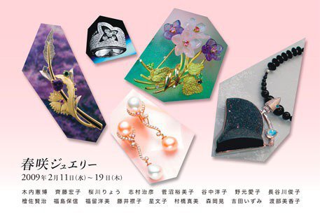関東地区会員による「春咲ジュエリー」展開催 会 期: 2009年2月11日(水)~19日(木)10:00~19:00(平日)/10:00~17:00(日曜、祭日)初日12時から/最終日15時迄 無休 会 場: 彌屋ギャラリー東京都千代田区内幸町1-1-1帝国ホテル本館地階アーケード内 主 催: (社)日本ジュウリーデザイナー協会 関東地区委員 入場無料