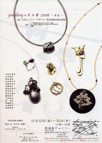 地域交流会員展 jewelleryの十二月2008 ─再生─ 刈谷市で開催 会期: 2008年12月12日(金)~25日(木)11:00~1900 会期中無休 会場: 悠遊舎ぎゃらりぃ愛知県刈谷市半城土町大湫99-3悠遊舎1階 TEL 0566-61-0321 出品者: 会員15名 主催: (社)日本ジュウリーデザイナー協会 共催: 悠遊舎ぎゃらりぃ 入場無料
