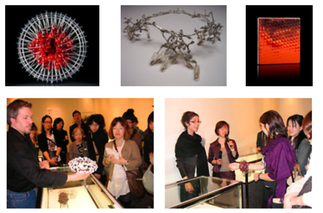 2008公募日本ジュエリーアート展では、アメリカのジュエリーアーティスト作品を招待展示し、国内5都市で巡回して46点の作品を紹介いたしました。上野と伊丹では来日作家によるギャラリートークも実施しました。