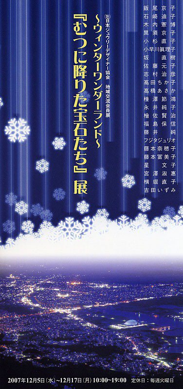 地域交流会員展 ~ウィンターワンダーランド~ 『むつに降りた宝石たち』展 会期: 2007年12月5日(水)~17日(月)10:00~19:00 火曜定休 会場: (株)高橋時計店 ジュエリータカハシ青森県むつ市本町3-9 TEL 0175-22-3010 出品者: 会員23名 主催: (社)日本ジュウリーデザイナー協会 共催: (株)高橋時計店 ジュエリータカハシ 入場無料