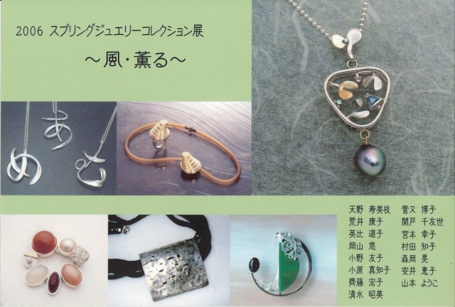 地域交流会員展 大阪市帝塚山で開催 2006スプリングジュエリーコレクション展 -風・薫る- 会 期:5月17日(水)~5月29日(月)11:00~18:00 会 場:PoPoLoクラフトギャラリー 大阪市住吉区帝塚山中3-8-30帝塚山ビル1F TEL 06-6675-4441 主 催:JJDA 共 催:PoPoLoクラフトギャラリー 参加者:15名 天野寿美枝 荒井康子 英比道子 岡山 悠 小野友子 小原真知子 齊藤宏子 清水昭美 菅又博子 関戸千友世 宮本幸子 村田知子 森岡 晃 安井惠子 山本ようこ