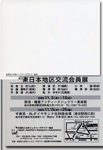東日本交流会員展 栃木県で開催 会期/会場1:2005年11月3日~13日 穐葉アンティークジュウリー美術館1階 栃木県那須郡那須町高久丙1790-20 TEL 0287-76-4580 会期/会場2:2005年11月15日~25日 宇都宮BL(ビュ・ラテン)ダイヤモンド社特設ギャラリー 栃木県宇都宮市伝馬町2-10 TEL 028-632-7750 主 催:JJDA東日本地区委員会 参加者:8名 柏倉主和 黒須京子 小林誠 佐藤壽希子 種澤和彦 種澤節鴻 手塚信夫 船木ゆずか