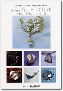 地域交流会員展 神戸市で開催 2004オータムジュエリーコレクション展 会 期:2004年9月2日(木)~9月7日(火)11:00~19:00 会 場:ギャラリー住吉倶楽部 神戸市東灘区住吉本町1-5-8モンシャトーKビル2F TEL 078-841-9839 参加者:10名 青柳典子 飯野喜美子 川口敦子 小杉直子 近藤美和子 鳥越啓子 成瀬今日子 藤本奈穂子 八木喜美子 安井惠子