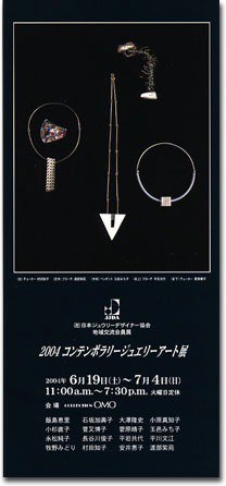 地域交流会員展 熊本で開催 2004コンテンポラリージュエリーアート 会 期:2004年6月19日(土)~7月4日(日)11:00~18:00 会 場:Collection OMO 熊本市上通町4-14大森ビル3F TEL 096-356-4721 主 催:JJDA 共 催:Collection OMO 参加者:16名 飯島恵里 石坂加壽子 大澤隆史 小原真知子 小杉直子 菅又博子 菅原晴子 玉邑みち子 永松純子 長谷川俊子 平岩共代 平川文江 牧野みどり 村田知子 安井恵子 渡部紫苑