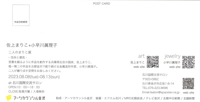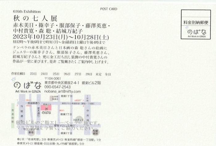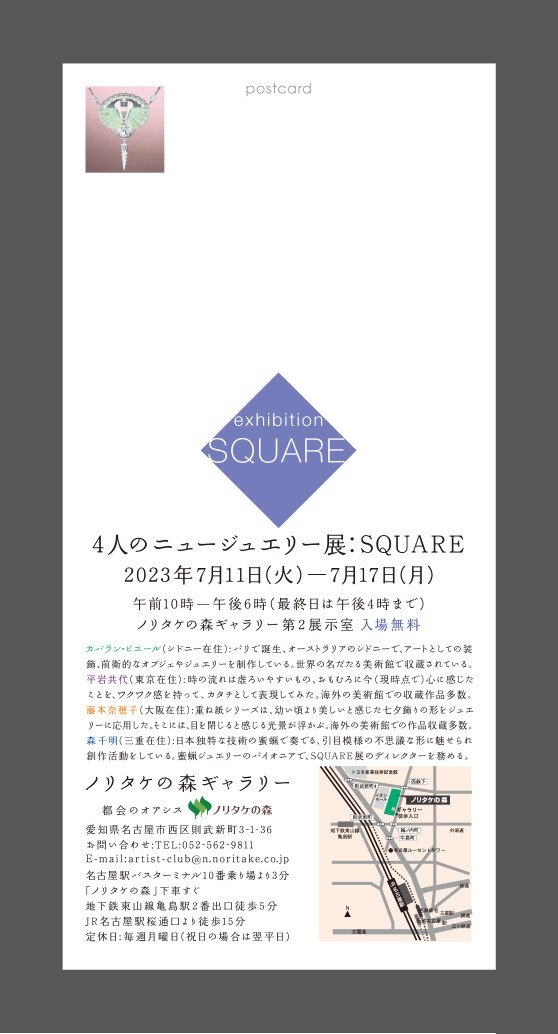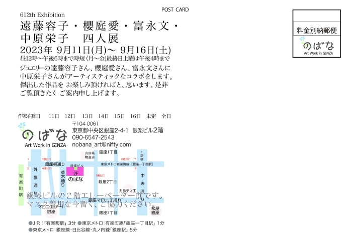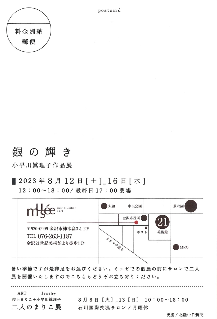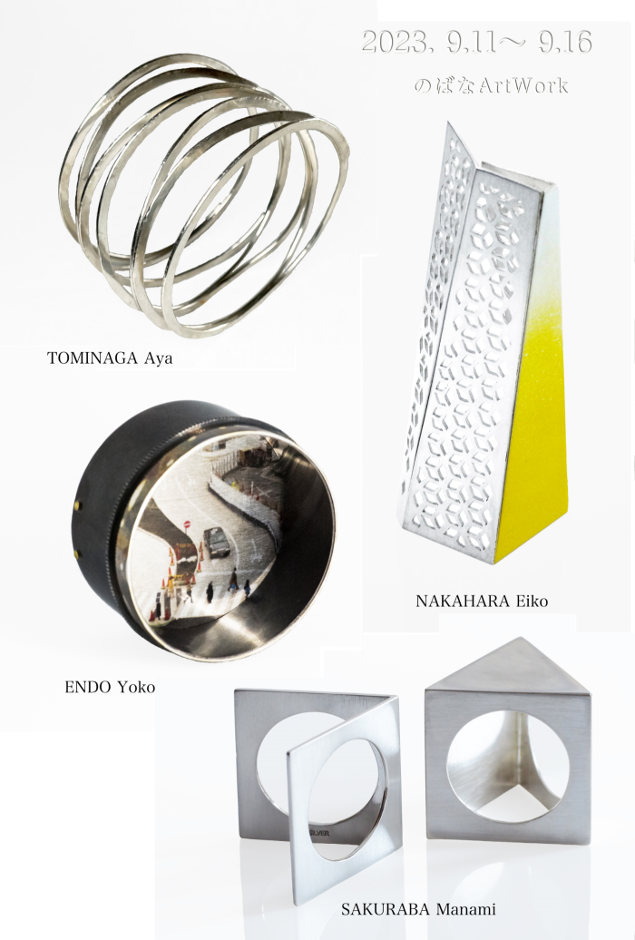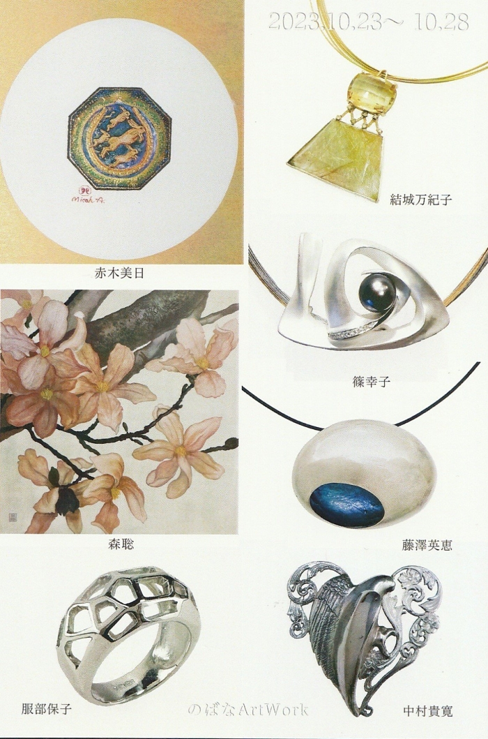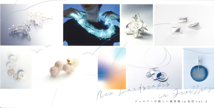 ジュエリーの新しい風景展 in 金沢 vol.4 正会員:石野 匡美, 内田 良子, 浦嶋 洋子, 海野 えり子, 英比 道子, 柏原 エリナ, 金子 礼子, 北田 美千枝, 小早川 眞理子, 小張 恵子,近藤 依子, 坂井 尚子, 桜川 りょう, 佐々木 正子, 澤本 雅子, 重田 恵美子, 管 まりお, 菅原 晴子, 中島 凪, 中原 栄子, 鳴海 多恵子, 畑中 範子, 藤本 奈穂子, 安井 惠子