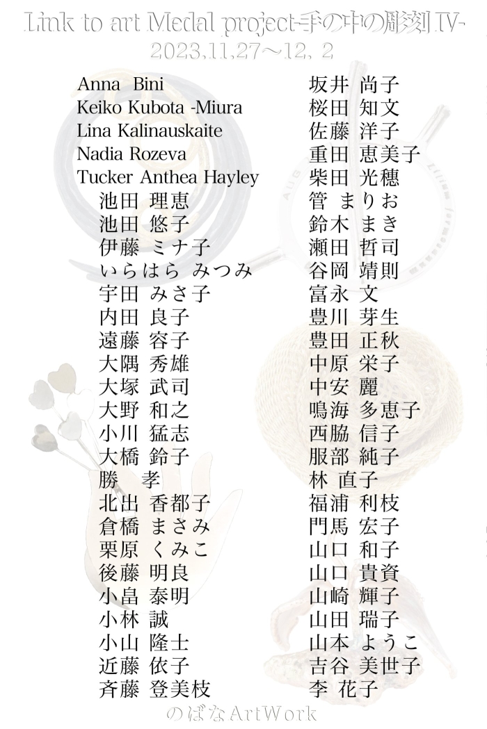 Link to art Medal project -手の中の彫刻 IV- 名誉会員:小林誠 正会員:池田理恵、宇田みさ子、内田良子、近藤依子、坂井尚子、佐藤洋子、重田恵美子、管まりお、中原栄子、鳴海多恵子、西脇信子、服部純子、門馬宏子、山本ようこ