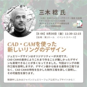 今年8月に東京ビッグサイトで開催されるジャパンジュエリーフェア2024(JJF)にて、JJDA主催のセミナーを開催いたしました。 JJDAの監事でもいらっしゃる三木 稔先生に、「CAD・CAMを使った新しいリングのデザイン」と題してご講演いただきました。