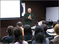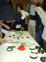 水野孝彦氏によるセミナーは、定員を超える74名の受講者で熱気にあふれて始まり、前半はスライドを見ながらのコンセプチュアルな作品と感覚的な作品、海外作家について学び、後半は休憩時間に受講者から集めたアンケートに基づく質疑応答、さらに欧米のコンテンポラリージュエリーを取り巻く環境の紹介と世界に足を踏み出すためのヒントについて、また実例を学びました。会場には、氏のコレクションである海外作家のコンテンポラリーなジュエリーも展示され受講生は間近に見学もできました。